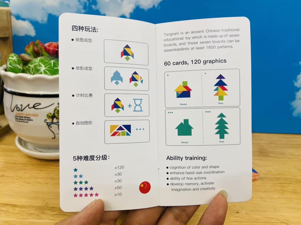 Gồm 7 miếng gỗ nhiều màu sắc, và sách hướng dẫn ghép, 60 thẻ với120 mẫu hình đi kèm.